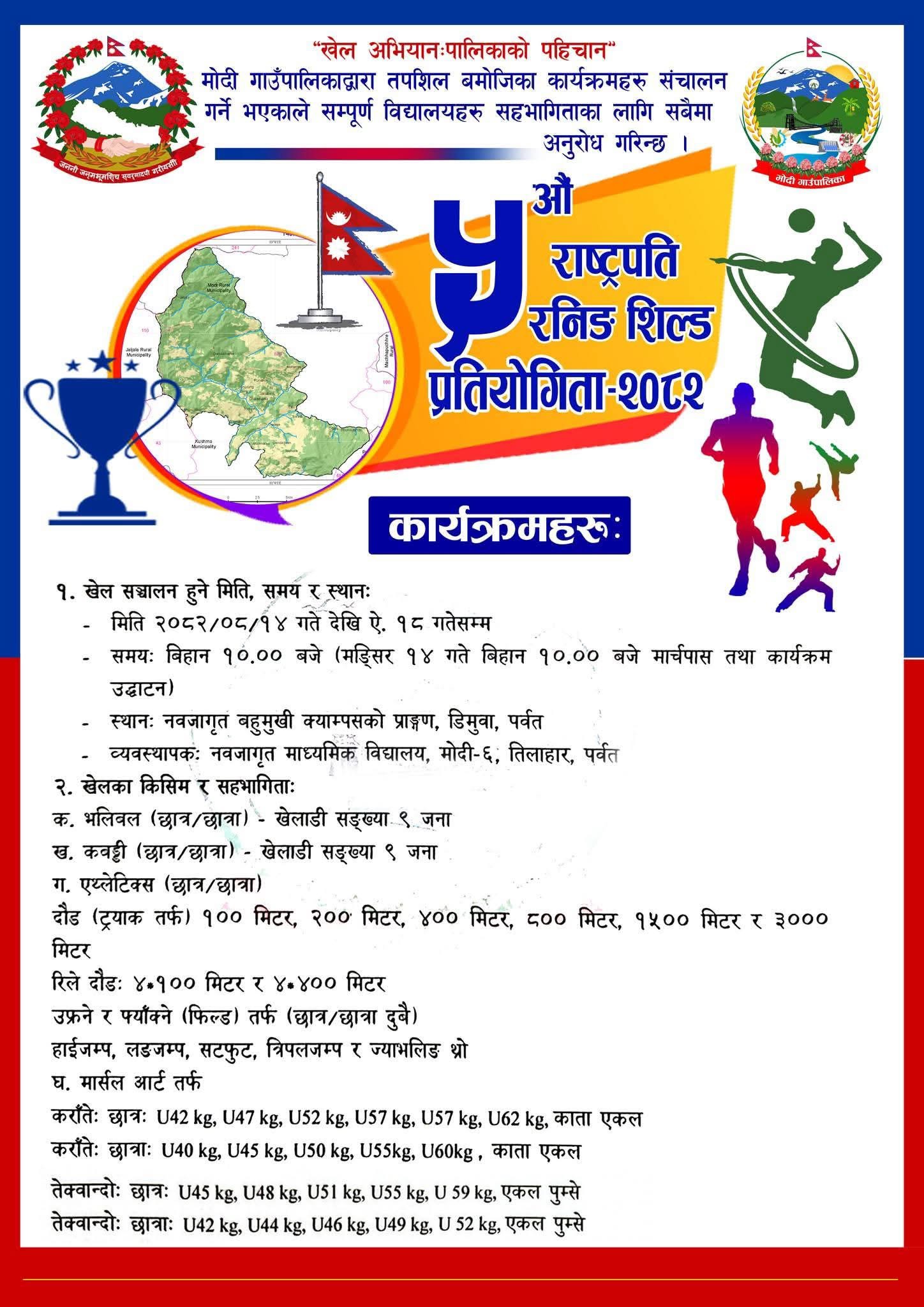 पर्वत । पर्वतको मोदी गाउँपालिकाले खेल अभियानः मोदीको पहिचान भन्ने मूल नाराका साथ प्रथम अध्यक्ष कप प्रतियोगिता तथा पाँचौँ राष्ट्रपति रनिङ शिल्ड प्रतियोगिता मंसीर १४ गतेदेखि १९ गतेसम्म आयोजना गर्ने भएको छ। तिलाहारस्थित नवजागृत बहुमुखी क्याम्पसको खेलमैदानमा आयोजना हुने प्रतियोगिताको तयारीका लागि गाउँपालिकाले पत्रकार सम्मेलन गरी जानकारी दिएको छ।