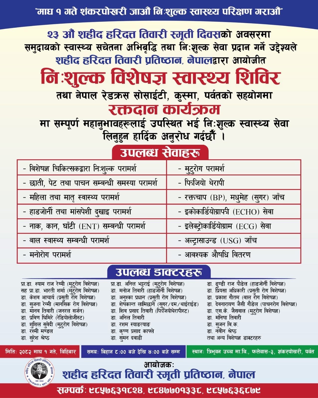 पर्वत। २३ औं शहीद हरिदत्त तिवारी स्मृति दिवसको अवसरमा पर्वतको शंकरपोखरीमा निःशुल्क विशेष स्वास्थ्य शिविर तथा रक्तदान कार्यक्रम आयोजना गरिने भएको छ। समुदायको स्वास्थ्य सचेतना अभिवृद्धि गर्नुका साथै निःशुल्क स्वास्थ्य सेवा प्रदान गर्ने उद्देश्यले शहीद हरिदत्त तिवारी प्रतिष्ठान, नेपालद्वारा कार्यक्रम आयोजना गर्न लागिएको हो।